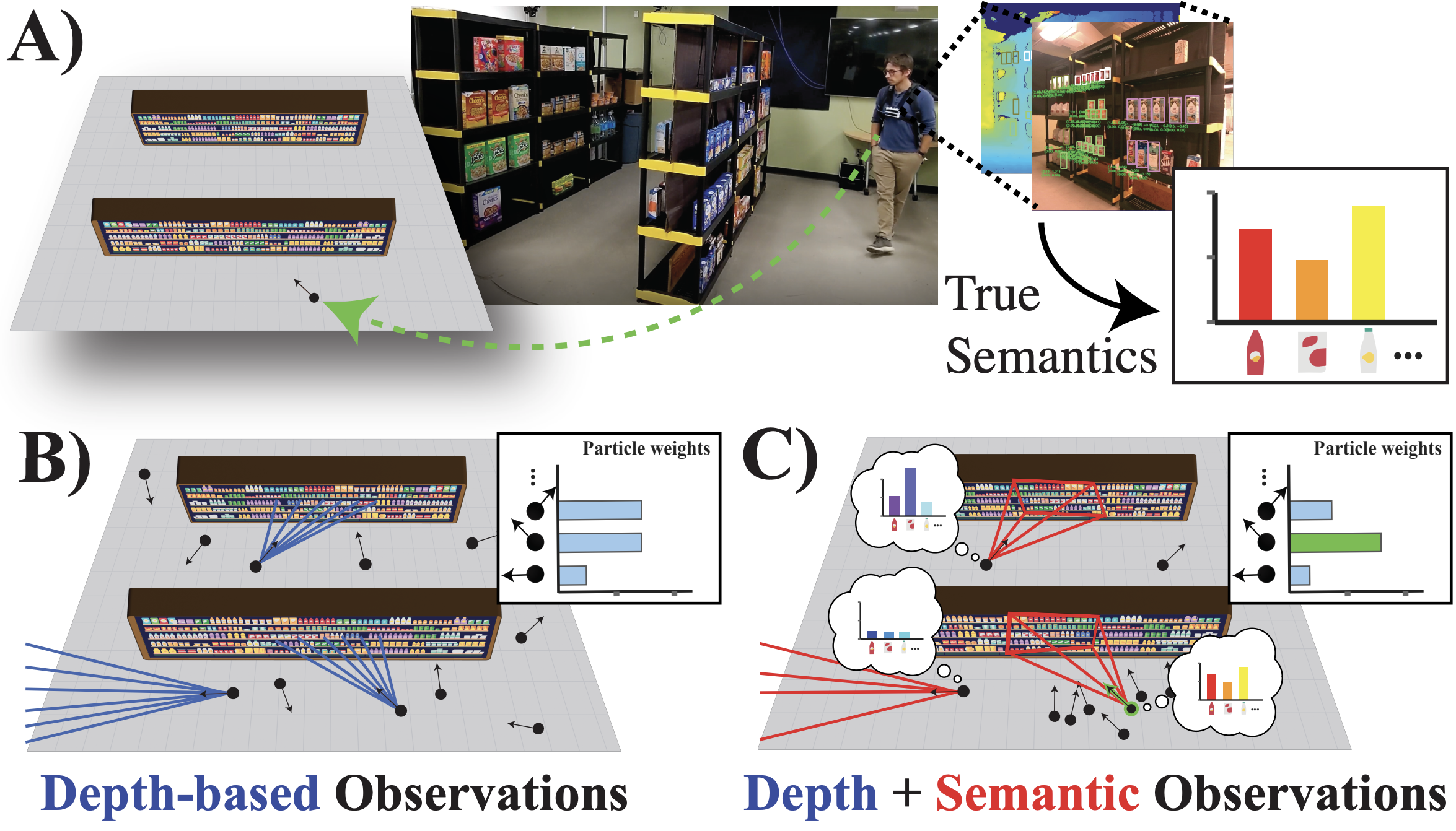 Localization in dynamic, visually aliased environments like grocery stores is a difficult challenge for autonomous systems. Aisles often look identical geometrically, and stock changes frequently. ShelfAware is a novel semantic localization framework that achieves robust, real-time global localization using only low-cost sensors—specifically, a monocular RGB-D camera on a smartphone. Unlike traditional methods that rely on expensive LiDAR or detailed geometric maps, ShelfAware uses a Semantic Particle Filter. It leverages Visual-Inertial Odometry (VIO) for motion estimation and corrects drift by matching detected product categories (e.g., “cereal”, “soda”) against a lightweight semantic map. This allows the system to localize accurately even in featureless or repetitive aisles.